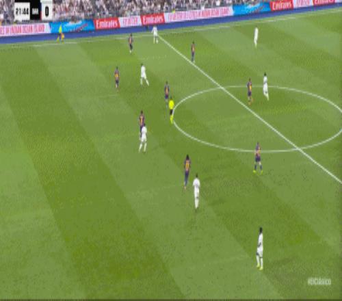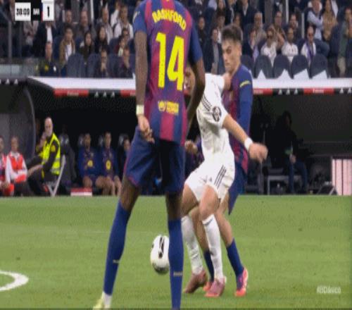第28分鐘,皇馬前場(chǎng)右側(cè)60度角任意球快發(fā),姆巴佩插上拿球突入禁區(qū)小角度怒射,門將什琴斯尼奮力將球撲出。第37分鐘,巴薩前場(chǎng)左側(cè)高位逼搶,巴爾韋德將球傳回中路,居萊爾停球停大了,佩德里上搶將球斷走,巴薩這邊就地反擊,連續(xù)的配合,拉什福德禁區(qū)左側(cè)策應(yīng)橫傳中路,后排跟進(jìn)的費(fèi)爾明小禁區(qū)前沿迎球大力推射,皮球應(yīng)聲入網(wǎng),巴薩1:1扳平比分。僅僅4分鐘后皇馬這邊快速回應(yīng),維尼修斯左路硬超孔德下底傳中,米利唐后點(diǎn)高高躍起頭球擺渡頂?shù)介T前,巴薩這邊防守漏人,無(wú)人防守的貝林厄姆門線前凌空將球掃入半空門,皇馬2:1快速的再次取得領(lǐng)先。