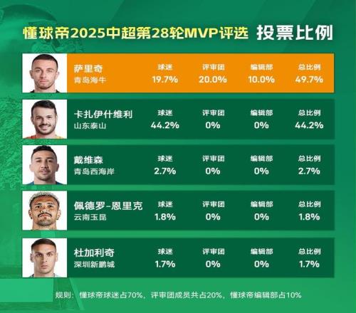大家好,歡迎來(lái)到懂球帝2025賽季中超MVP評(píng)選現(xiàn)場(chǎng)。中超第28輪MVP得主出爐,青島海牛隊(duì)35歲老將、隊(duì)長(zhǎng)薩里奇憑借在工體的3球1助攻,以5.5%的優(yōu)勢(shì)反超山東泰山隊(duì)的前鋒卡扎伊什維利,當(dāng)選本輪中超的MVP。