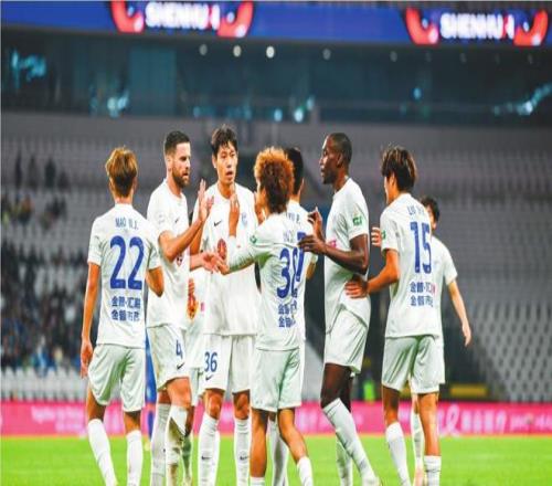 圖為客戰(zhàn)上海申花隊,英博海發(fā)隊球員慶祝進(jìn)球。 大連英博足球俱樂部供圖